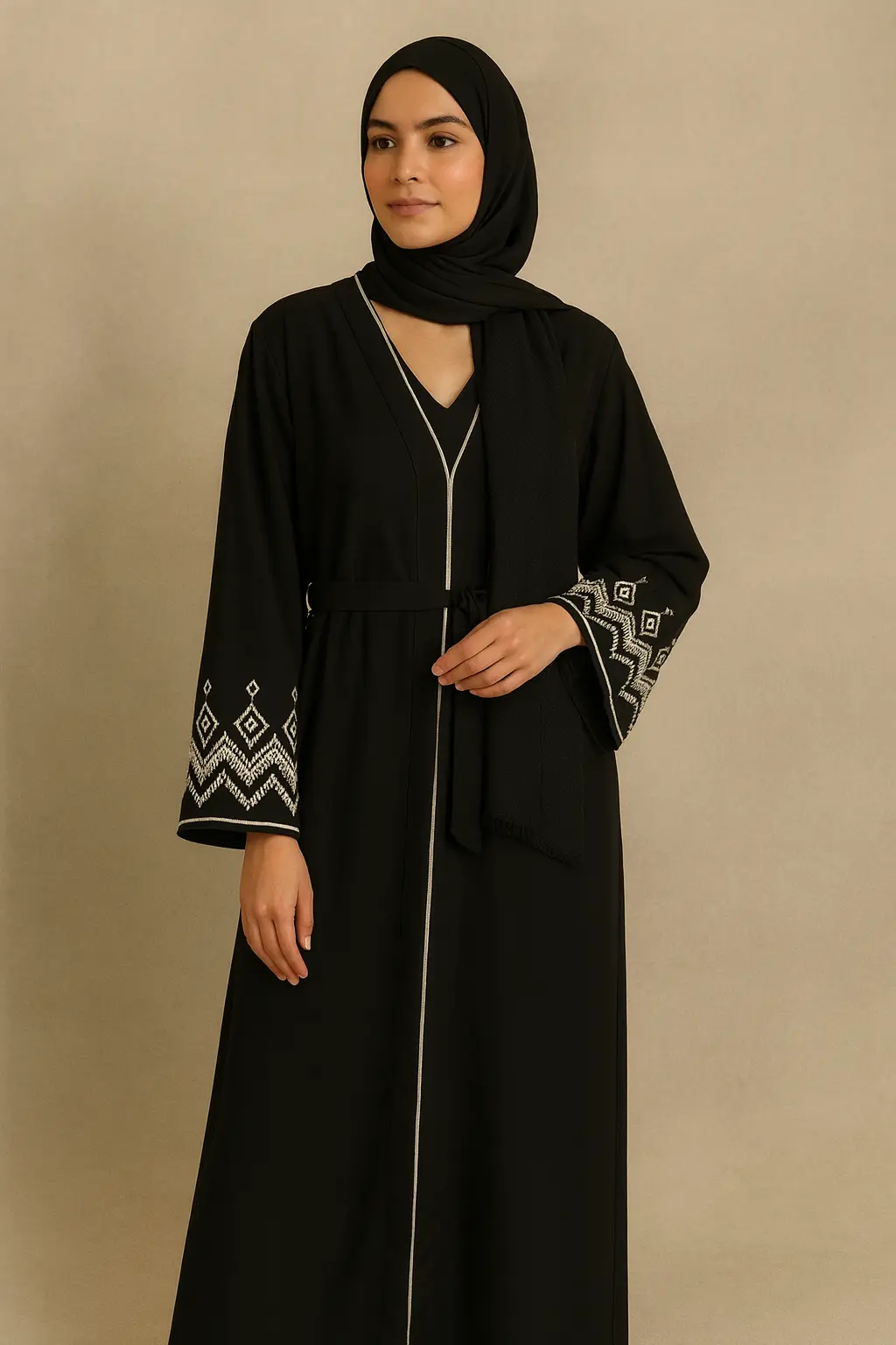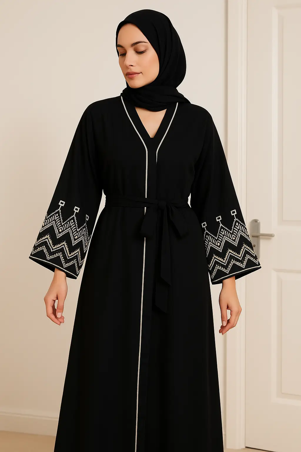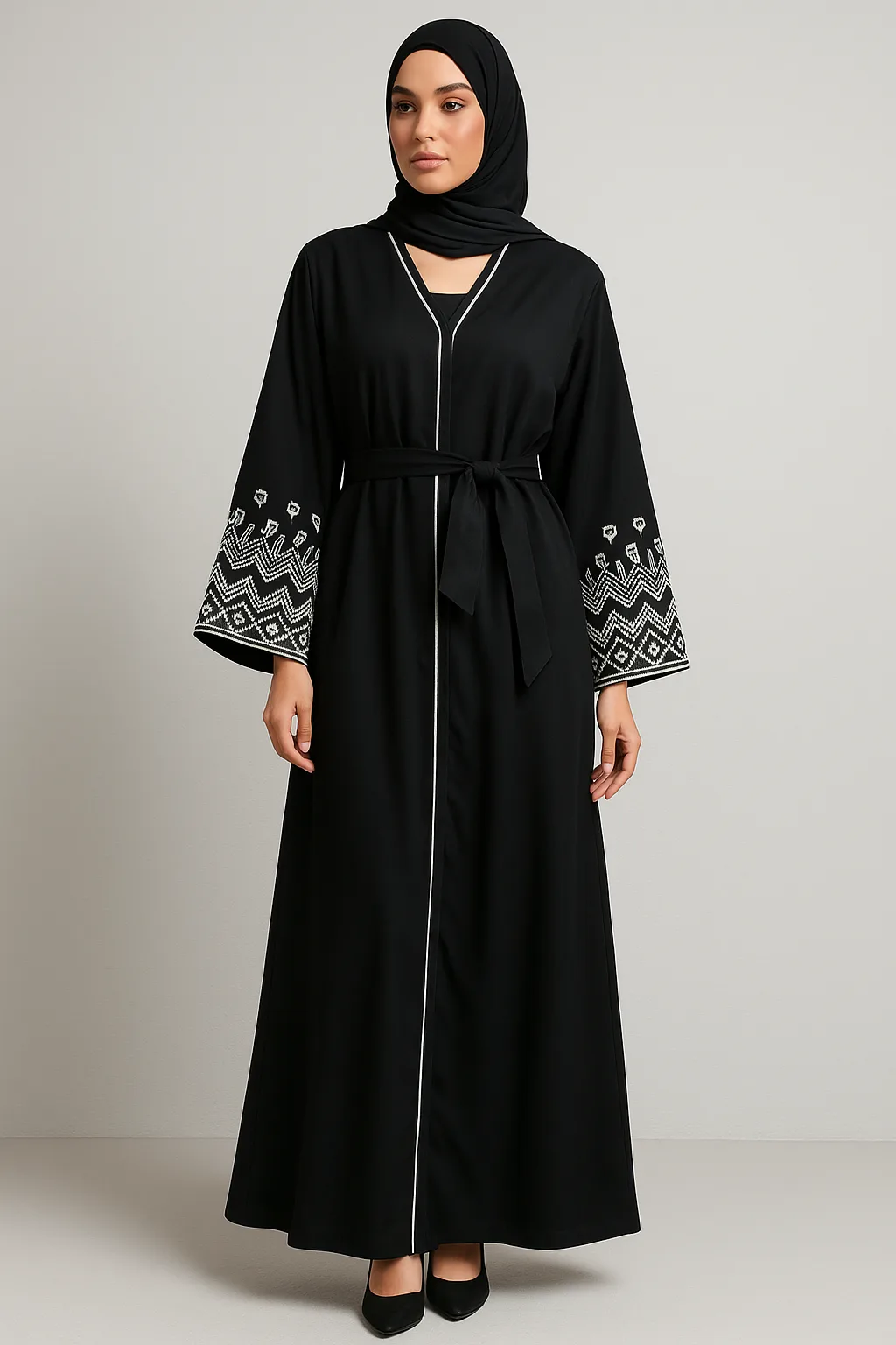 • Open abaya with geometric embroidered sleeves and white piping
